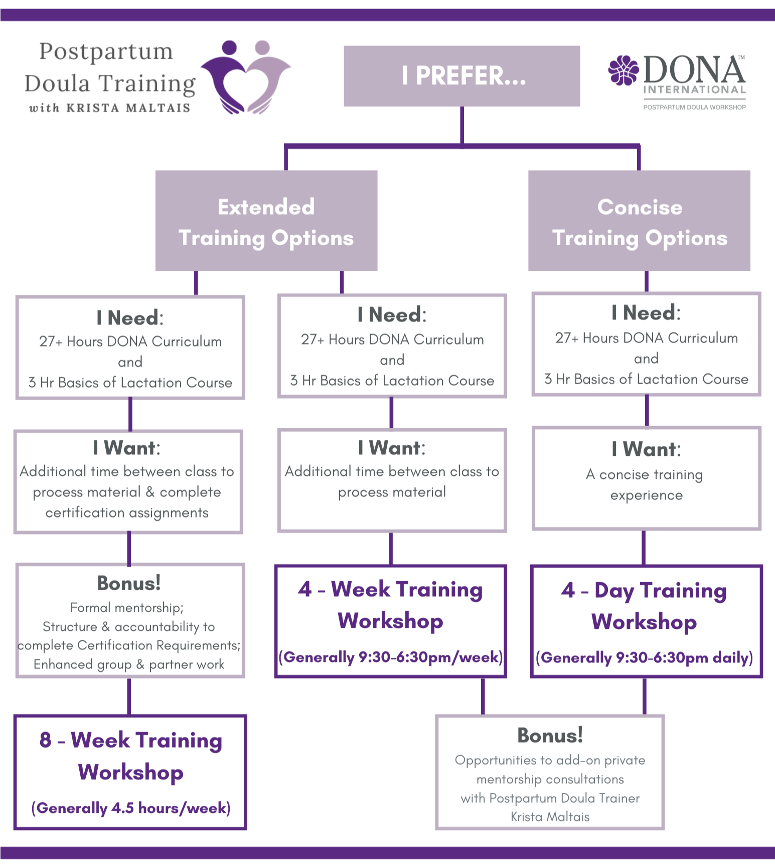 DONA International requires a minimum of 27 workshop training hours that cover specific topics. This “core curriculum” is divided into 4 days of learning. Bonus! Postpartum Doula Training with AdvPCD/PDT(DONA) Krista Maltais also includes the 3-hour Lactation Support for Professionals course!